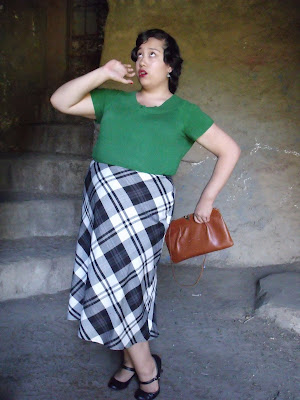1930's Here I come! My outfit wasn't very depressing haha, but it's still period appropriate. I pinned my hair up in faux finger waves, my sweater top is from Sears, my plaid skirt is from The Avenue, The shoes are from Pay-less, My earrings are 1910s/1920s style and my purse is Vintage.